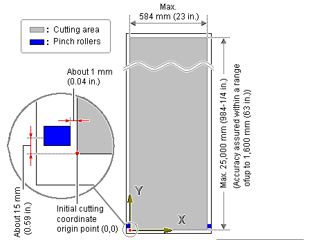 *Maximum width can be extended up to 604 mm (23-3/4 in.) depending on settings. However, this may cause the pinch roller to leave marks on the deliverables. Exercise caution. For instructions on how to extend the cutting area, refer to "Extending the Cutting Area (EXTEND)."