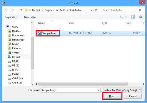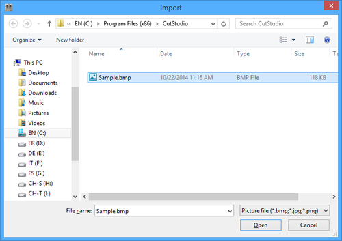 In this example, you will open the Sample.bmp file found in the CutStudio installation folder (usually located in the CutStudio folder under Program Files on the C drive).